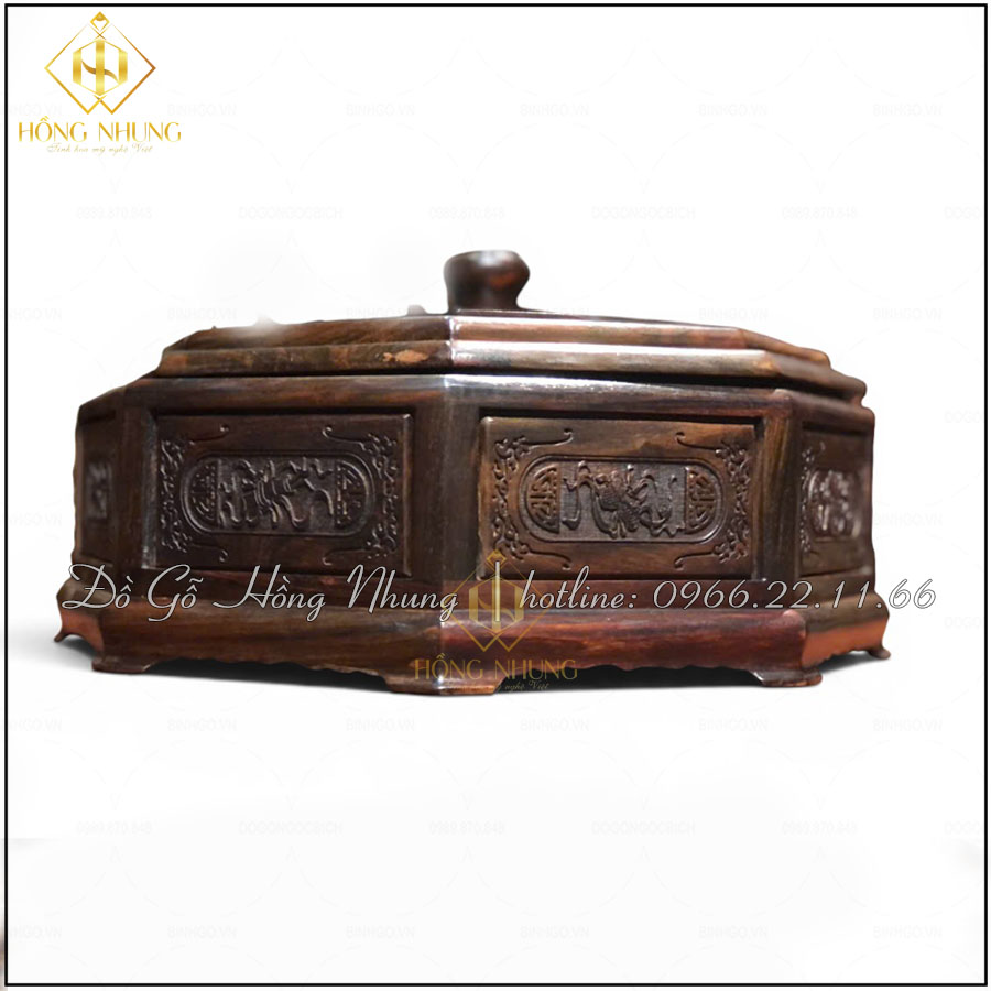 Từng đường nét hoa văn trên nắp, thành hộp hay chân đế đều được đục chạm tỉ mỉ. Một số mẫu còn khắc họa tiết phong thủy như: