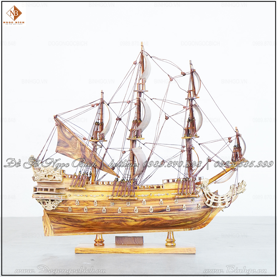 Phần thân thuyền được làm từ gỗ sưa liền khối, đảm bảo sự chắc chắn và bền đẹp theo thời gian. Bề mặt gỗ được đánh bóng bằng dầu tự nhiên, giúp giữ nguyên vân gỗ tự nhiên, đồng thời tạo độ sáng bóng sang trọng. Bộ buồm mở rộng tượng trưng cho hành trình vươn ra biển lớn – biểu tượng cho sự thành công, thăng tiến và khát vọng vươn xa.